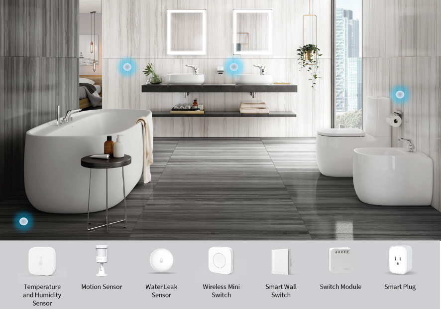 Temperature and humidity detection, with automatic exhaust fan activation during bathing.