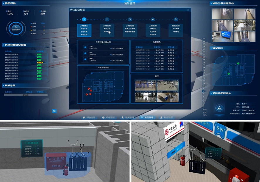 Connect to the fire protection system, display the distribution of fire-fighting equipment/materials in 3D, link to locate alarm positions, retrieve surrounding videos.